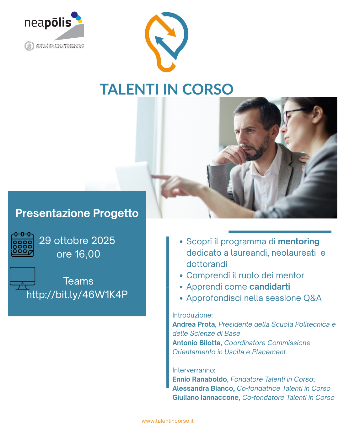 Talenti in Corso – mercoledì 29 ottobre alle ore 16 verrà presentato su teams il progetto Talenti in Corso un programma di mentoring per laureandi e neolaureati